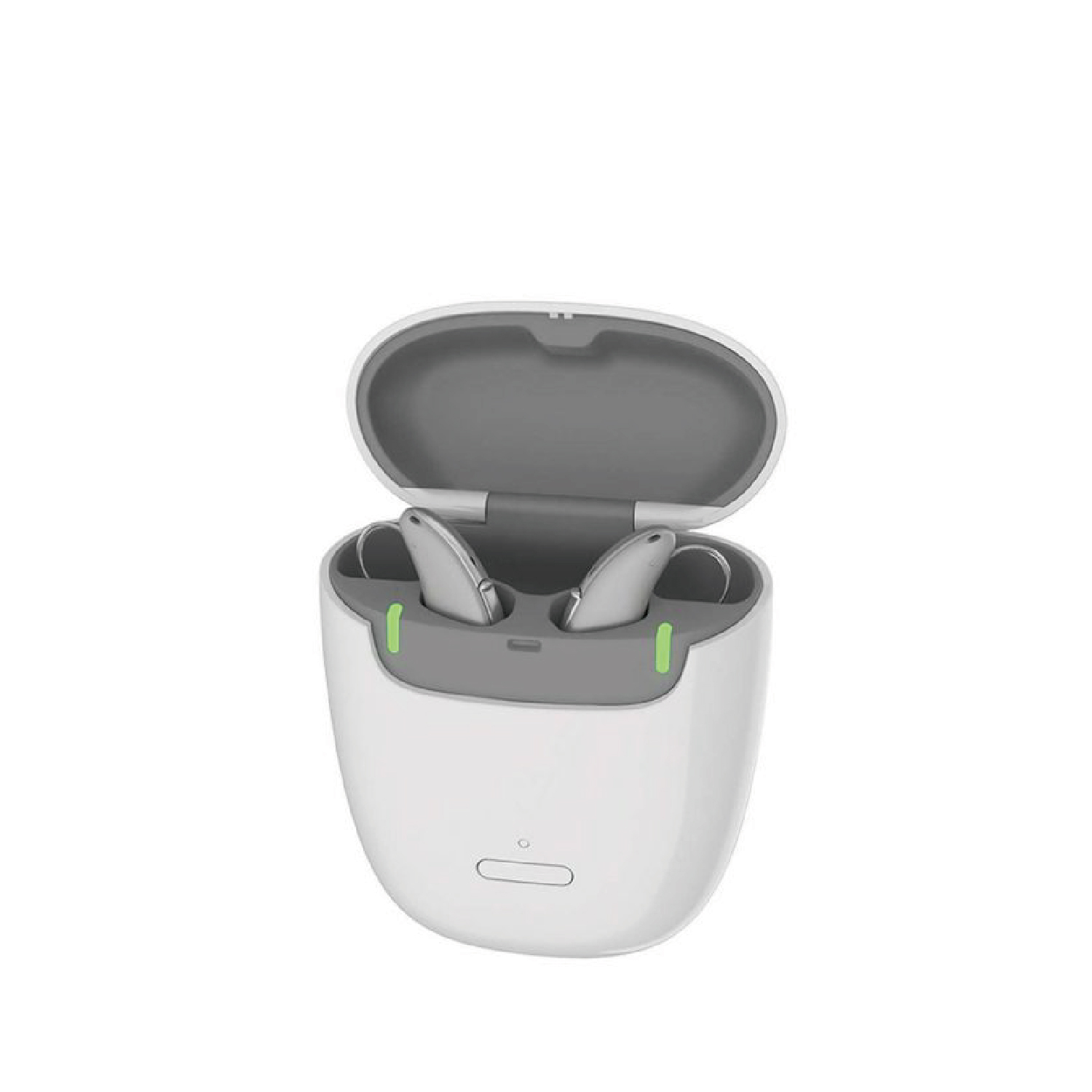 Pure 行動充電盒有著典雅外型,提供 Pure Charge&Go AX 收納與行動充電,其蓄電量足夠為一對助聽器充滿 3 次電,充電盒蓋則可保護充電盒避免堆積灰塵。兩側各有助聽器的 LED 充電指示燈,中間則有充電盒的電量指示燈。 用戶也可以選擇除濕型充電盒,除濕、充電、UV 消毒,一次搞定,讓您的助聽器隨時保持最佳狀態